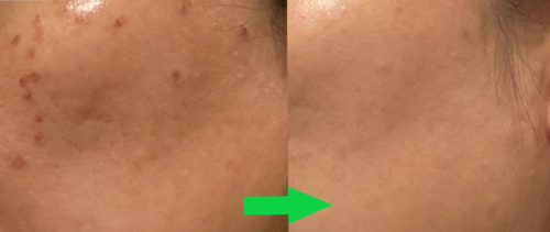 (写真左)はレーザー後3日目くらい。炎症からかさぶたになりつつある状態です。そこからさらに3〜4日後(写真右)、かさぶたが取れて、気になっていた部分はきれいになりました。