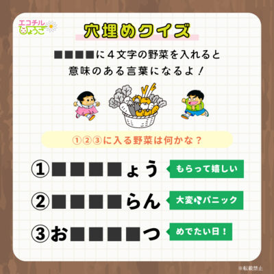 ちょっとしたヒマつぶしに思わず解きたくなる! 楽しい脳トレ&クイズコーナー、エコチルひょうごチャレンジGO!!へようこそ★ 今回は「穴埋めクイズ」だよ!挑戦してみてね(^_−)−☆ …|続きを見る≫
